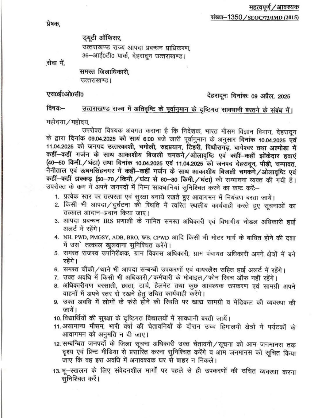 भारत मौसम विज्ञान विभाग, देहरादून द्वारा दिनांक 09.04.2025 को सायं 6:00 बजे जारी पूर्वानुमान के अनुसार, दिनांक 10.04.2025 एवं 11.04.2025 को जनपद उत्तरकाशी, चमोली, रुद्रप्रयाग, टिहरी, पिथौरागढ़, बागेश्वर तथा अल्मोड़ा में कहीं-कहीं गर्जन के साथ आकाशीय बिजली चमकने/ओलावृष्टि एवं कहीं-कहीं झोंकेदार हवाएं (40-50 किमी./घंटा) की सम्भावना व्यक्त की गयी है।