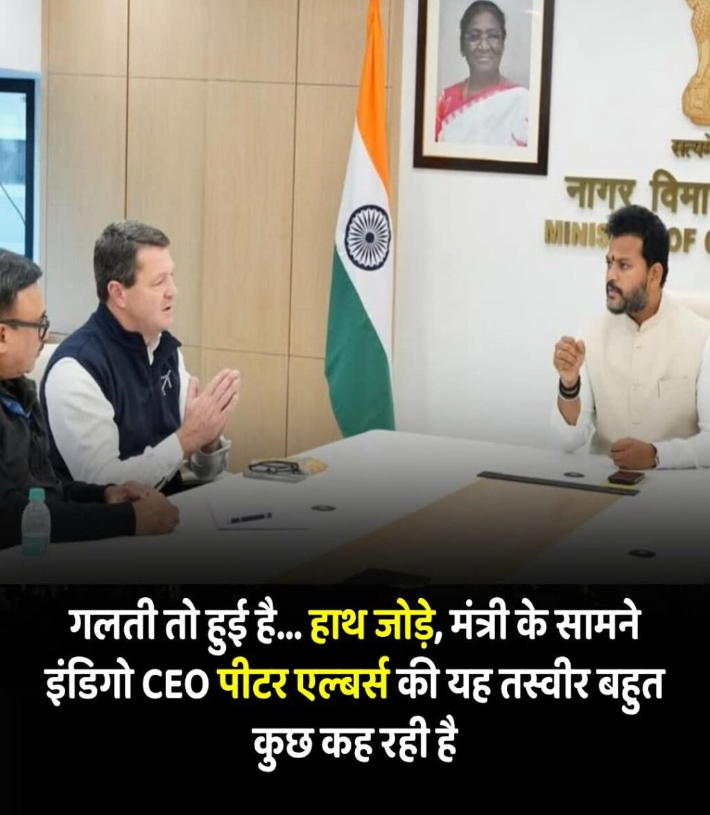 नागरिक उड्डयन मंत्रालय (MoCA) ने मंगलवार को इंडिगो के सीईओ पीटर एल्‍बर्स को एयरलाइन की परिचालन स्थिति की समीक्षा के लिए तलब किया था. इस दौरान मंत्री के सामने सीईओ के हाथ जोड़कर बैठने की तस्‍वीर सोशल मीडिया पर छा गई. मंत्री राम मोहन नायडू ने भी इसे अपने ‘एक्‍स’ हैंडल से शेयर किया.