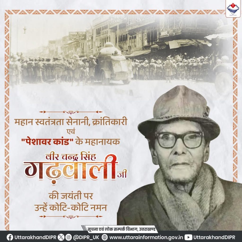 मुख्यमंत्री श्री पुष्कर सिंह धामी ने पेशावर कांड के नायक वीर चन्द्र सिंह ‘गढ़वाली‘ का उनकी जयंती पर भावपूर्ण स्मरण किया है। मुख्यमंत्री ने वीर चन्द्र सिंह ‘गढ़वाली’ की जयंती पर जारी अपने संदेश में वीर चन्द्र सिंह “गढ़वाली” को पेशावर कांड का महानायक बताते हुए कहा कि उन्होंने देश की आजादी के लिये आन्दोलनरत निहत्थी जनता पर गोली चलाने के आदेश को न मानकर देशभक्ति और साहस का परिचय दिया था।