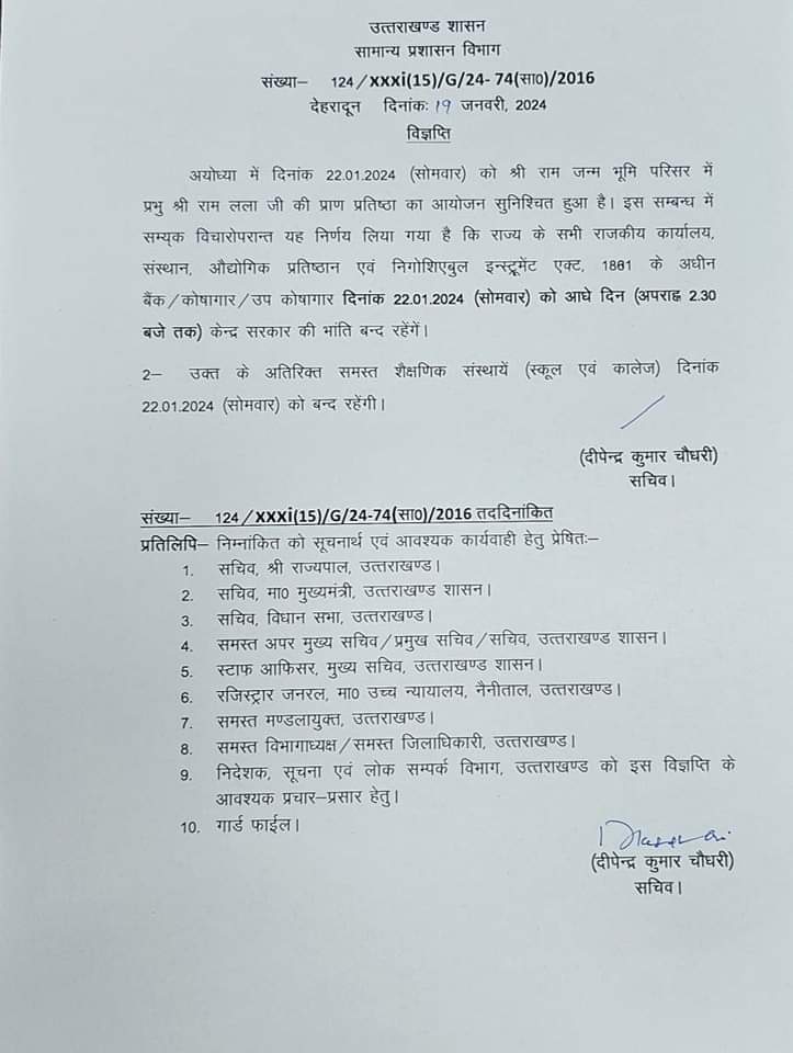 अयोध्या में 22 जनवरी 2024 को होने वाले श्री राम जन्म भूमि में श्री राम लला की प्राण प्रतिष्ठा के अवसर पर, उत्तरखंड में सामाजिक गतिविधियों के साथ-साथ सरकारी कार्यालयों, संस्थानों, औद्योगिक प्रतिष्ठानों, बैंकों, कोषागारों और उप कोषागारों को आधे दिन (अपराह्न 2.30 बजे तक) के लिए बंद करने का निर्णय लिया गया है। जिससे सम्पूर्ण राज्य को धार्मिक आनंद और उत्साह का मौका मिलेगा।