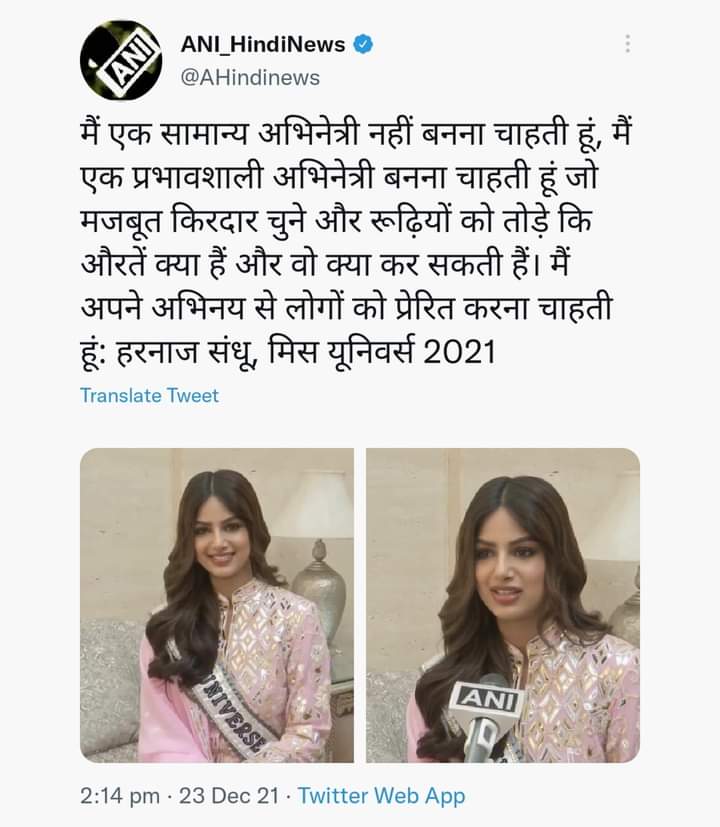 हरनाज अपनी बेबाक बोली और बोल्ड अंदाज़ के लिए काफी लोकप्रिय हो गई हैं, हरनाज़ को लोग हमेशा इसी अंदाज में देखना पसंद करते हैं, ऐसा ही हुआ जब ANI के एक पत्रकार द्वारा उनके आने वाले फिल्मी करियर के बारे में पूछा गया, हरनाज का जवाब कुछ यूं था : (फोटो देखें)
