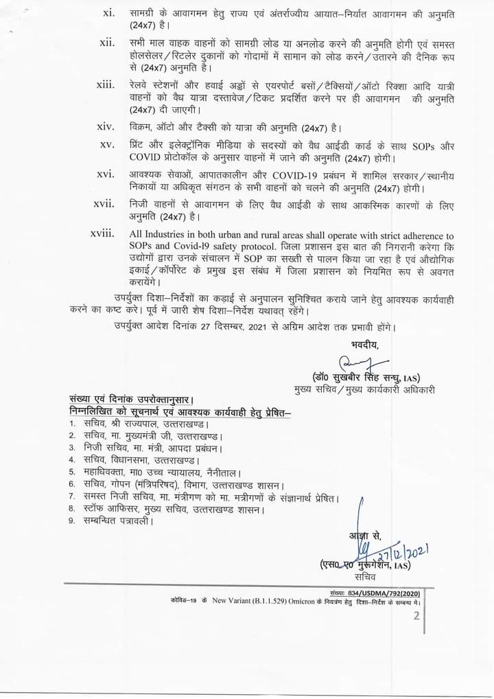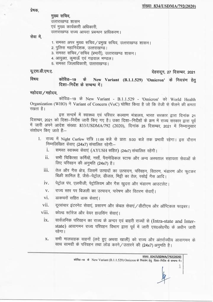 कोविड-19 के नए वैरिएंट Omicron के नियंत्रण हेतु उत्तराखण्ड शासन द्वारा पूरे प्रदेश में आज से नाइट कर्फ़्यू लागू किया गया है। नाइट कर्फ़्यू रात 11:00 बजे से सुबह 5:00 बजे तक रहेगा। इस दौरान सभी आवश्यक सेवाएं जारी रहेंगी और जरूरी कार्यों के लिए आवागमन की छूट मिलेगी।