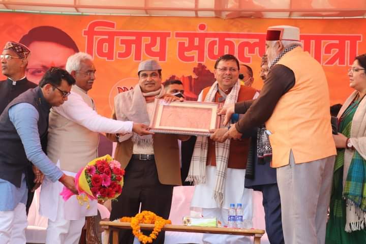 केंद्रीय सड़क परिवहन, राजमार्ग मंत्री श्री नितिन गडकरी एवं मुख्यमंत्री श्री पुष्कर सिंह धामी ने खटीमा में आयोजित “विजय संकल्प यात्रा – कुमाऊं मंडल” कार्यक्रम में प्रतिभाग किया। कार्यक्रम में सहकारिता विभाग द्वारा 166 स्वयं सहायता समूहों को ₹213.50 लाख के चैक वितरित किए गये।केन्द्रीय सड़क एवं परिवहन मंत्री नितिन गडकारी ने कहा कि उत्तराखण्ड के बारे में पूरे देश में कहा जाता है कि यह देवों की भूमि है। देश-विदेश की जनता उत्तराखंड को देवभूमि और राज्य की जनता को देव तुल्य मानती है। बद्रीनाथ, केदारनाथ, गंगोत्री, यमुनोत्री यह हमारे आस्था, श्रद्धा के प्रतीक है। उन्होंने कहा कि मेरा यह सौभाग्य रहा है गंगा को अविरल और निर्मल करने की जिम्मेदारी मुझे मिली और उसका मेरे द्वारा ₹25000 करोड़ के अविरल निर्मल गंगा के लिए नमामि गंगे प्रोजेक्ट में कार्य किया जा रहा है जिसका 80 प्रतिशत कार्य मेरे कार्यकाल में पूरा हुआ।श्री गडकरी ने सड़क निर्माण क्षेत्र में किये जा रहे कार्यों एवं प्रस्तावित कार्यों के बारे में विस्तार से जानकारी देते हुए कई घोषणाएं भी की। उन्होंने सिमली-मुन्स्यारी-जौलजीबी-ग्वालदम तक सड़क चौड़ीकरण करने, खटीमा से पूरनपुर मार्ग को एनएच किए जाने की घोषणा की।उन्होंने खटीमा चौराहे से थारू विकास भवन तक एनओसी क्लीयर करने, पीलीभीत मार्ग से टनकपुर मार्ग मे बाहर बाईपास बनाए जाने, नजीमाबाद से अफजलगढ तक ग्रीनफील्ड न्यू बाईपास बनिये जाने की घोषणा की।उन्होंने हल्द्वानी से काठगोदाम और लालकुआं तक बाईपास बनाने, हल्द्वानी-ग्वालदम सड़क निर्माण, खटीमा रिंगरोड निर्माण हेतु चकरपुर-कालापुर होते हुए टेढ़ाघाट वाया पहेनिया बाईपास का निर्माण भारतमाला परियोजना मे लिए जाने की घोषणा की।श्री गडकरी ने मुख्यमंत्री पुष्कर सिंह धामी की तारीफ करते हुए कहा कि युवा मुख्यमंत्री दिखने में ही नही काम में भी स्मार्ट हैं। उन्होंने कहा कि सड़कों के निर्माण से राज्य पर्यटन के क्षेत्र में और अधिक मजबूत कर सकेगा। उन्होंने कहा कि पर्यटन के क्षेत्र में भी रोजगार के नए अवसर उपलब्ध होंगे।मुख्यमंत्री श्री धामी ने केंद्रीय मंत्री श्री नितिन गडकरी को रोड कनेक्टिविटी के क्षेत्र में क्रांति लाने वाला व्यक्ति बताया। उन्होने कहा आपके मंत्री के रूप में काम करने से सड़कों के क्षेत्र में प्रदेश सहित पूरे देश में अभूतपूर्व कार्य हुए है।