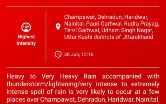भारतीय मौसम विज्ञान विभाग के पूर्वानुमान अनुसार 29 एवं 30 जून 2025 को उत्तराखण्ड के देहरादून, उत्तरकाशी, रुद्रप्रयाग, टिहरी, पौड़ी...