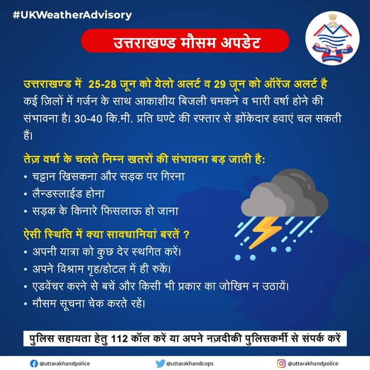 मौसम विभाग ने उत्तराखण्ड में 25-28 जून के मध्य येलो अलर्ट व 29 जून को ऑरेंज अलर्ट जारी किया है। आप से निवेदन है कि कृपया सावधानी बरतें और मौसम के अनुसार ही यात्रा करें।